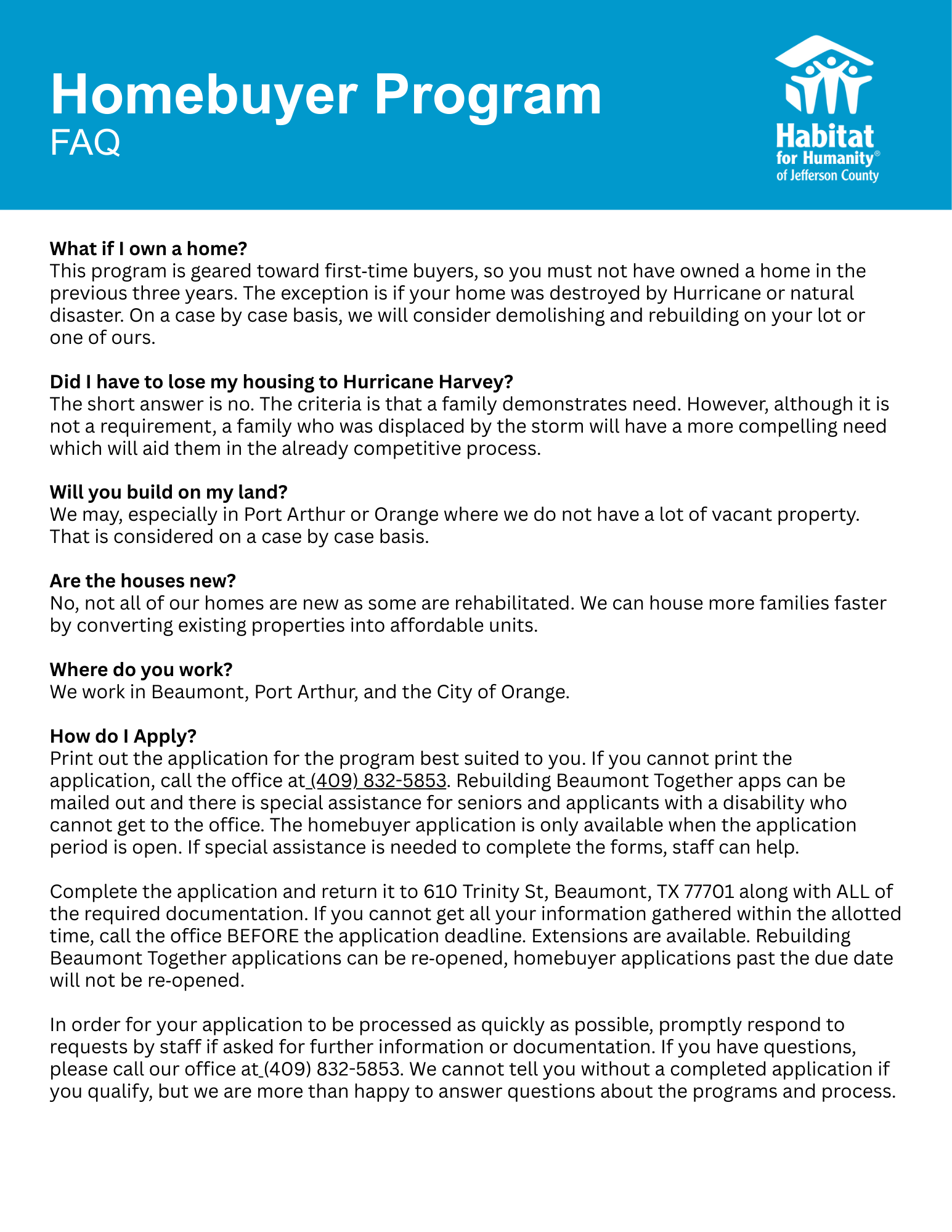 Habitat for Humanity of Jefferson County builds decent and affordable homes around Jefferson County, Texas in partnership with families in need of a decent place to live. Habitat homebuyers help build their own homes alongside volunteers and pay an affordable mortgage.